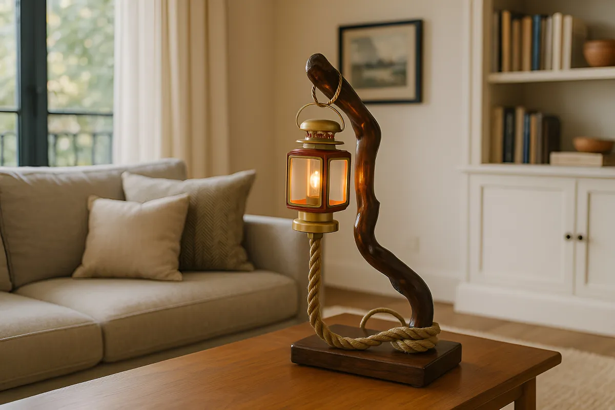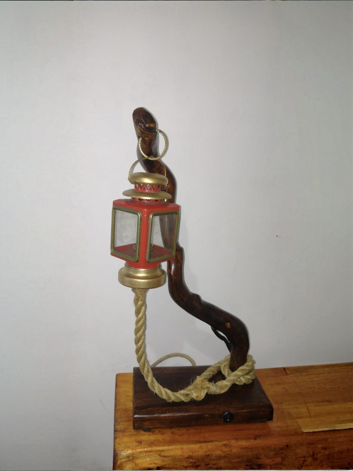 Lámpara velador elaborada artesanalmente única e irrepetible con faro antiguo de carreta,